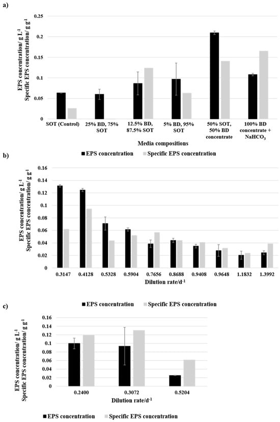 In continuous cultivation, 50% BD concentrate showed a decreasing EPS concentration with an increased dilution rate, following a similar trend for specific EPS concentration. The highest EPS yields were comparable to the literature values [