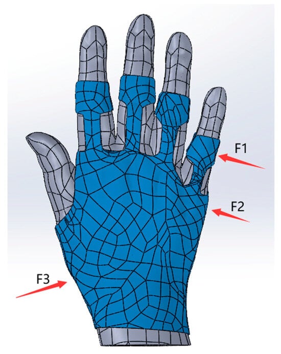 Finite Element Analysis of Three-Point Force Correction: A three-point force analysis model for RA was employed to evaluate the virtual stress and displacement changes before and after the application of the hand orthosis. In consideration of the patient’s condition, slight ulnar deviation and hyperflexion of the fifth finger were observed. To simplify the analysis, this study focuses on three-point force correction at 50% flexion and 50% radial deviation. The boundary conditions and the flexion and radial deviation movements were identical to those described previously. Subsequently, the RA composite model was subjected to a three-point force in the coronal plane, in line with the aforementioned working conditions. This approach aimed to determine whether the application of a three-point force could effectively correct the deformities in RA patients when using the hand orthosis. The three-point forces in the coronal plane were applied at the ulnar side of the fifth proximal interphalangeal joint, the ulnar side of the metacarpophalangeal joint, and the radial side of the radial carpal joint, as illustrated in Figure 2 (F1, F2, and F3). According to the literature [], human skin’s pressure tolerance is 2.5 N/cm2. Additionally, clinical experience suggests that the general corrective force does not exceed 10 N. Therefore, in the subsequent finite element analysis, the magnitude of the three-point force was adjusted to evaluate the orthopedic effect of the hand orthosis on RA patients, while adhering to the aforementioned limits.