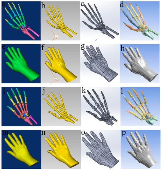 Models of the normal hand and hand of an RA patient. (a–d), (e–h), (i–l), and (m–p) show the models obtained via Mimics, Geomagic Studio, SolidWorks, and Workbench software for normal hand bone, normal hand soft tissue, RA hand bone, and RA hand soft tissue, respectively.