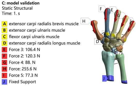 As for boundary condition settings, to facilitate convergence of the solution, the proximal ends of the radius and ulna were fully restrained. The stops of the carpometacarpal joints and some of the tendons (Abductor pollicis longus, flexor carpi radialis, flexor carpi ulnaris, extensor carpi ulnaris, extensor carpi radialis brevis, and extensor carpi radialis longus) were fixed to prevent movement in the x- and y-directions, thereby ensuring that the bones would move in the direction of the applied load [].