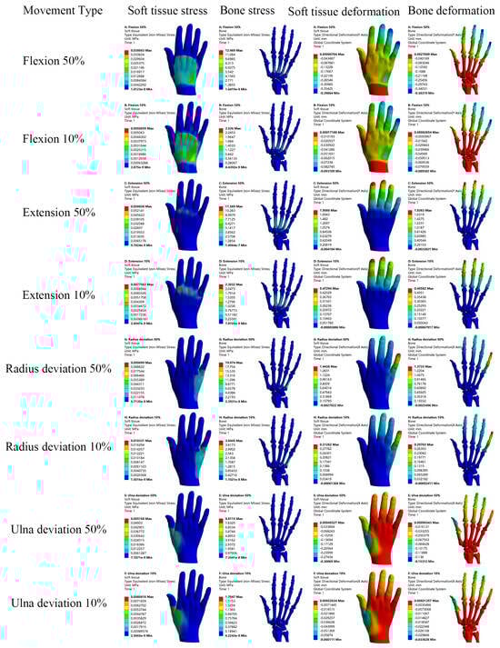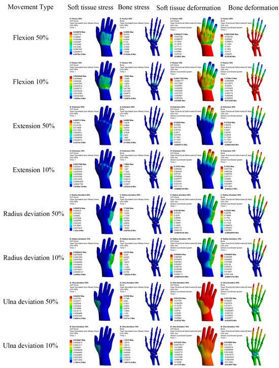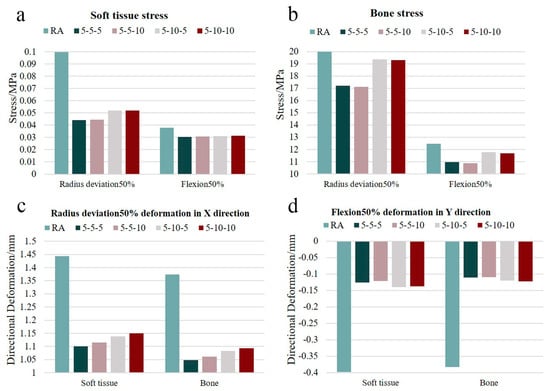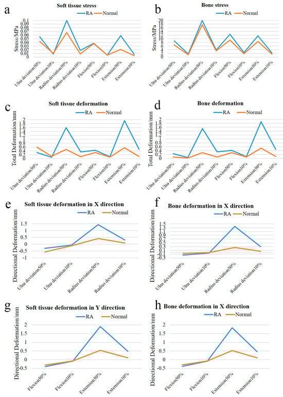 Loads were applied to both the normal and RA hand models to simulate four motions: flexion, extension, radial deviation, and ulnar deviation. The resulting stress, total displacement, and directional displacement cloud maps of the soft tissues and bones are presented in Figure 5 and Figure 6. In this analysis, directional displacements in the Y-direction were observed during flexion and extension, while directional displacements in the X-direction were observed during radial and ulnar deviation, in accordance with the direction of load application. In order to compare and analyze the cloud data and distribution differences between the normal and RA hand models more intuitively, the data were tabulated and the related line chart was obtained, as shown in Figure 7.