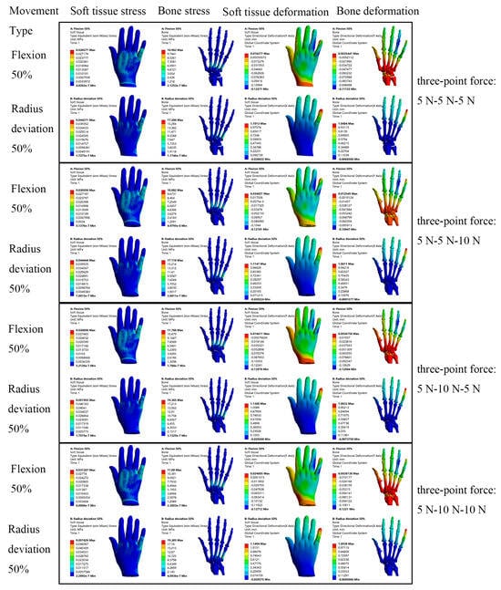 When the patient wears the hand orthosis, the application of the three-point force is mainly adjusted by the tightness of the Velcro. Since the force exerted between the soft tissues and the orthosis is mutual, the three-point force is applied to the inner surface of the orthosis during its virtual usage. The magnitude of the orthopedic force was set based on the literature and the practical experience of orthotists []. In this study, the three-point force was applied at the ulnar side of the fifth proximal interphalangeal joint, the ulnar side of the metacarpophalangeal joint, and the radial side of the radial carpal joint with the following configurations: (1) 5 N-5 N-5 N, (2) 5 N-5 N-10 N, (3) 5 N-10 N-5 N, and (4) 5 N-10 N-10 N. The stress and displacement clouds of soft tissue and bone of the hand under different orthopedic forces can be obtained, as shown in Figure 8. The data obtained from the cloud diagrams were processed and tabulated to generate the corresponding histograms, as shown in Figure 9.