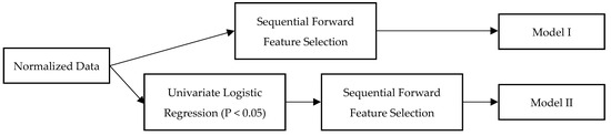 This study employed a range of traditional and ML algorithms, including LR, random forest (RF), extreme gradient boosting (XGB), k-nearest neighbor (KNN), support vector machine (SVM), and neural network (NN). The dataset was randomly divided into training and test sets in a 7:3 ratio. To maintain balance, an equal number of mortality and non-mortality cases were included in the test set, while the remaining cases were assigned to the training set. The Synthetic Minority Oversampling Technique (SMOTE) was applied to the training set to enhance the representation of minority classes. When datasets are imbalanced, ML algorithms tend to favor the majority class, which can lead to high overall prediction accuracy but poor results for the minority class [18]. SMOTE is a well-established method for mitigating issues related to imbalanced data by oversampling the minority class. The training data were subsequently utilized to develop and train the model. A grid search algorithm, combined with ten-fold cross-validation, was implemented to determine the optimal hyperparameters for the model. In model I, sequential forward feature selection was employed for feature selection. In contrast, the model II implemented this technique after identifying variables significantly associated with mortality at 90 days through univariate LR, setting a significance threshold of p < 0.05. The feature selection process in models I and II is illustrated in Figure 1. Moreover, this study incorporated Shapley Additive Explanations (SHAP) to improve interpretability. 312 AIS patients were included in the external validation set. The median age of the population was 72 years (interquartile range [IQR]: 63.75–79), and the median baseline NIHSS score was 14 (IQR: 11–18). The mortality rate at 90 days was 17.9%. A comparison of variables between patients who experienced mortality within 90 days and those who did not in the external validation set is presented in Table S2. The algorithms were developed in Python 3.7, employing the Scikit-learn version 0.24.1 and XGBoost version 1.2.1 libraries.