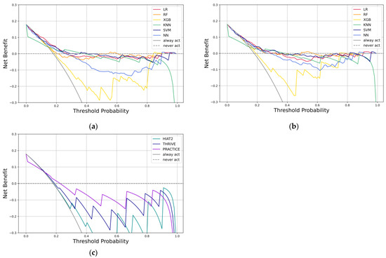 Decision Curve Analysis on the external validation set in (a) Model I, (b) Model II, and (c) prediction scores. HIAT: Houston Intra-Arterial Recanalization Therapy; KNN: K-Nearest Neighbor; LR: Logistic Regression; NN: Neural Network; PRACTICE: Predicting 90-day mortality of AIS with MT; RF: Random Forest; SVM: Support Vector Machine; THRIVE: Totaled Health Risks In Vascular Events; XGB: Extreme Gradient Boosting.