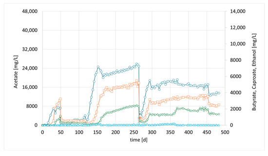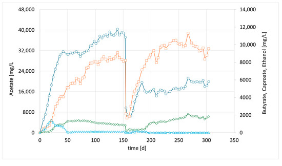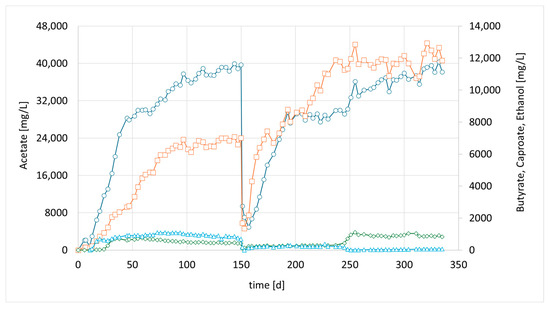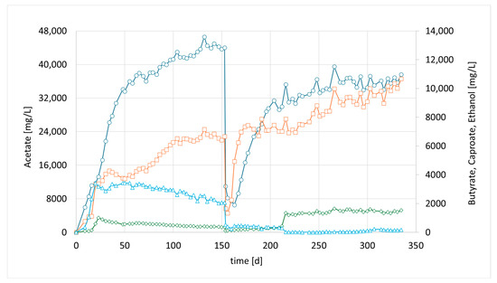 Course of metabolite concentration in CHER I; Indigo circles: acetate, orange squares: butyrate, green diamonds: caproate, blue triangles: ethanol; Key events: day 7—inoculation with M. sueciensis, day 49—media swap, day 119—media swap after fixing leakage; day 265—media swap. Sample for Metataxonomic analysis taken at day 315.