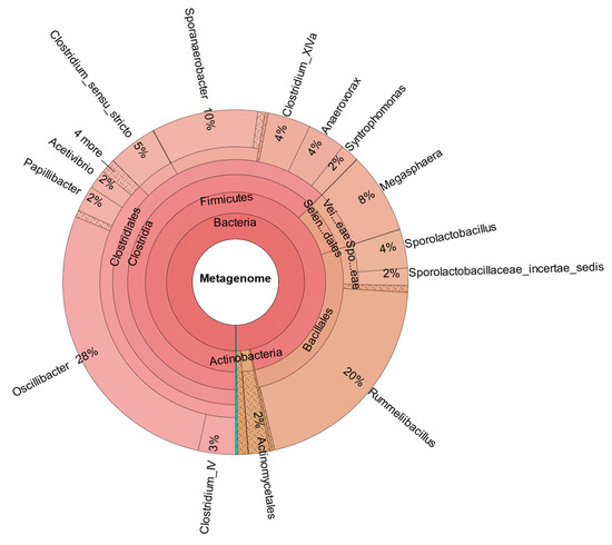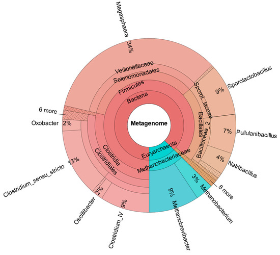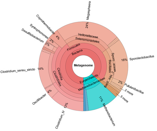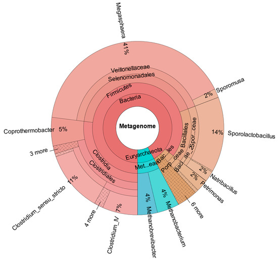 Figure 6 shows the composition of the consortium that was used as a starter culture for the reactors (data from Steger et al. [20]). The genus Megasphaera could not be detected in the inoculum, as demonstrated in Figure 6 and Supplementary Figure S1.