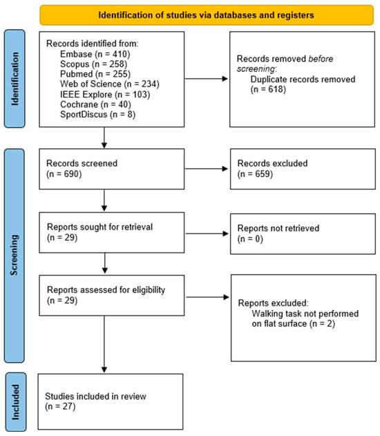 A total of 1308 papers were identified through the screening process across multiple databases. Among these, 618 papers were identified as duplicates, and 690 studies progressed to the screening phase. After an evaluation of the title and abstract of these studies against the pre-defined eligibility criteria, 29 papers were deemed eligible and included in the review. Following the assessment of the full articles, two additional studies were excluded as the walking task was not performed on a flat surface. Instead, the task involved climbing stairs or walking on a balance beam. The findings of our research are presented in the following sections. A visual representation of the screening and inclusion process can be found in Figure 1, which illustrates the steps outlined in the PRISMA flow chart.