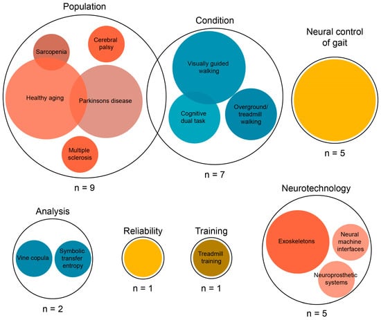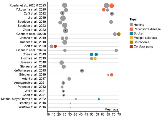 Apart from the aging population, studies also investigated participants with neurological or neuromuscular diseases. Nine studies included individuals with various neuromuscular disorders. Of these, four studies included Parkinson’s disease (PD) patients, two studies stroke survivors, one study participants with cerebral palsy (CP), one study multiple sclerosis (MS), and one study sarcopenia. The two most recent studies of Roeder et al. used the same sample of participants and are therefore only represented once in the graph [,]. Out of the 27 studies, 12 studies reported to have excluded one or more participants due to various reasons including extensive artifacts in EEG signal or problems associated with the footswitch recordings.
