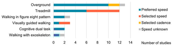 Information about the gait task and the determination of speed can be found in Figure 4. Among the 27 studies considered, 9 exclusively focused on a single gait condition, while the remaining studies examined multiple walking conditions. Apart from one study that focused solely on taking steps, the other studies examined continuous steady-state walking. This could be either on a treadmill or overground. Interestingly, Roeder et al. compared NMC between overground and treadmill walking []. In 55% of the normal gait conditions, participants walked at a self-selected, preferred speed. In the other studies, the speed or cadence was determined for the participant. Walking speed overall ranged from 1 to 4.8 km/h.