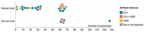 We analyzed the set-up and processing techniques for the EEG signal acquisition (Figure 5). Two studies used a limited number of 2 electrodes, and Zhao et al. opted for a set of 128 electrodes []. Two different methods for EEG artifact removal were primarily used. First, studies used independent component analysis (ICA), a signal processing technique used for separating a multivariate signal (e.g., EEG data) into additive, independent components. In the context of EEG artifact removal, ICA is applied to identify and isolate independent components that correspond to artifacts (e.g., eye blinks and muscle activity) from those that represent the underlying neural signals. By separating the signal into independent components, researchers can remove or correct the artifact components, thereby improving the quality and interpretability of the EEG data. The second used technique for artifact removal is artifact subspace reconstruction (ASR). ASR is an advanced method for automatically detecting and removing artifacts in EEG data. ASR works by modeling the artifact subspace using a statistical approach, allowing it to recognize and remove various types of artifacts, including abrupt and non-stationary ones. ASR can be particularly effective for cleaning EEG data by identifying and estimating the artifact components without prior knowledge of the artifact type. It provides a data-driven and automated approach to enhancing the quality of EEG recordings. Out of the 27 studies included in this review, 21 used ICA, while 8 used ASR. Of these, five studies used a combination of ASR and ICA, while four studies reported no artifact correction methods.