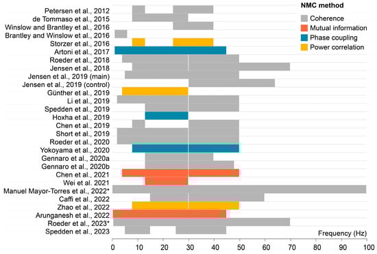 Method of quantifying neuromuscular connectivity (NMC) and frequencies of interest per study. * These studies did not report specific frequency ranges of interest, and therefore, this figure is based on band-pass filter information [,,,,,,,,,,,,,,,,,,,,,,,,,,].