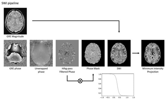 The SWI pipeline involves several steps. Initially, the phase image undergoes unwrapping to correct for phase discontinuities. Subsequently, a high-pass filter is applied to the unwrapped phase to eliminate phase variations not associated with tissue properties. The filtered phase data is then transformed into a phase mask, typically using a sigmoid function. Finally, the magnitude image is multiplied by this phase mask to generate the SWI. To enhance vein visualization, a minimum intensity projection technique can be employed. Modified from Rimkus et al. [] under the terms and conditions of the Creative Commons Attribution (CC BY) 4.0 license (https://creativecommons.org/licenses/by/4.0/ (accessed on 1 March 2025)).