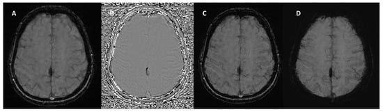 Brain MRI is the primary non-invasive imaging technique currently used in clinical practice for the study of the central nervous system [,,,], where SWI has established itself as a widely utilized clinical tool for imaging deoxyhemoglobin in veins, iron deposition, hemorrhages, calcifications, and microbleeds. Among the various pathologies of the central nervous system, in recent years there has been an increase in neurodegenerative diseases due to the aging of the population []. Neurodegenerative diseases encompass a spectrum of disorders characterized by the progressive degeneration and dysfunction of the nervous system, particularly affecting neurons, and often leading to cognitive, motor, and functional impairments, with symptoms varying across the range of severity and progression []. Given the difficulty in interpreting brain MRI in cases of suspected neurodegenerative disease with unclear clinical presentations, innovative imaging techniques such as SWI are being explored for their potential to improve early detection and ongoing patient care.