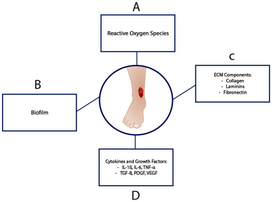 Major biochemical compounds that affect healing in the complex VU microenvironment. (A) Reactive oxygen species are generated due to iron overload. (B) Biofilm builds up as a result of wound site infection. (C) ECM components are dysregulated under inflammatory conditions. (D) Pro-inflammatory cytokines and growth factors are present. The figure is adapted from Coelho et al. [19].