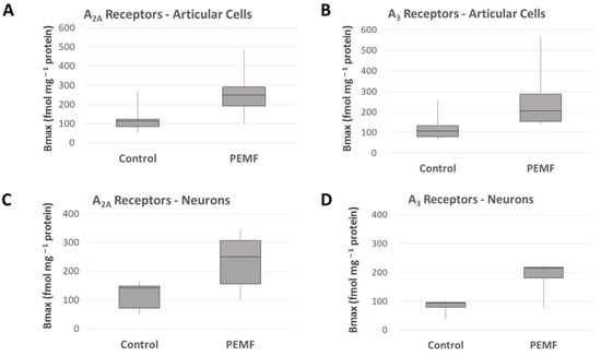 The anti-inflammatory and tissue-preserving effects exerted by PEMFs through specific action on adenosine receptors show great therapeutic potential in controlling brain inflammation and providing neuroprotection following ischemia and hypoxic brain damage. In order to assess whether PEMF stimulation was able to act on neuronal cells by modulating ARs, Varani et al. analyzed rat cerebral cortex tissue samples, cerebral cortex membranes and cortical neurons through saturation binding experiments [23]. In intact rat cerebral cortex and cortical neurons, PEMF stimulation induced a time and dose-dependent transient increase in A2A ARs. Later, Vincenzi et al. confirmed these results in PC12 rat adrenal pheochromocytoma and U87MG human glioblastoma cell lines (Figure 3C,D) [24]. Using A2A and A3 AR selective agonists, the authors were able to show that PEMF stimulation enhances the effect of AR agonists on cAMP production, demonstrating that PEMFs act by augmenting the activity of endogenous adenosine. The results in Nerve Growth Factor (NGF)-treated PC12 and U87MG cells also confirmed that the PEMF stimulation of A2A and A3 ARs led to significant reduction in NF-kB signaling activation.