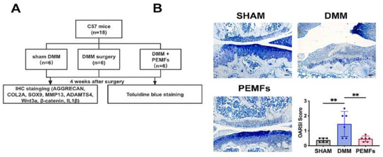 PEMF exerts cartilage protective effects in an OA mouse model and inhibits Wnt-βcatenin signaling. (A) Experimental group schematic. (B) Representative toluidine blue-stained joint sections from mice. Sham: Demonstrates normal articular and meniscal cartilage. DMM surgery: Demonstrates reduced toluidine blue staining in the articular cartilage. PEMF + DMM: Cartilage morphology and staining are grossly normal. OARSI scores show statistically significant differences between sham and DMM-only groups and between PEMF and DMM-only groups and are represented by **. Figure from Song et al. [61] and is cropped.