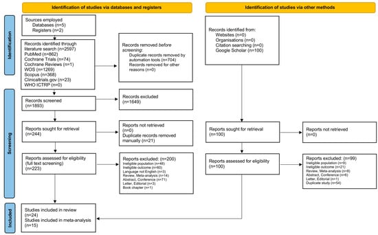 | Observational studies, randomized clinical trials, registry/database studies. | Systematic reviews, meta-analyses, narrative reviews, scoping reviews, opinion pieces, surveys, editorials, commentary letters, case reports, book chapters, conference abstracts, proceedings, or presentations. |