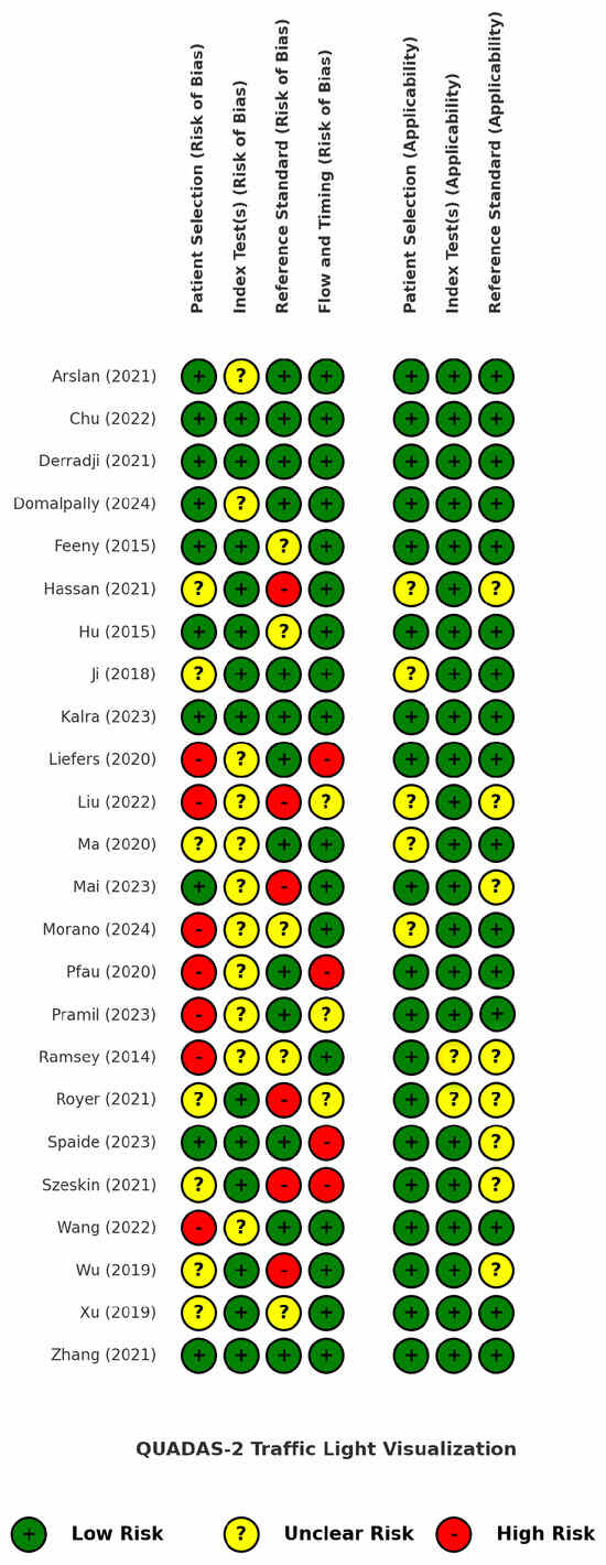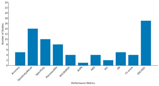 | Studies reporting at least one of the following metrics: accuracy, sensitivity/recall, specificity, precision/PPV, F1 score, AUC/AUROC, AUPR, IoU/OR, DSC/SDC, or AAD. | Studies without clear documentation of the purpose, dataset, data sources, patient distribution, methods, results, or conclusions. |
