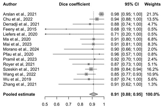 | Mai (2023) [41] | DL | DL model based on U-Net architecture | NR | Recall: 0.87; Precision: 0.87; DSC (mean): 0.86; DSC (median): 0.90 | Recall: 0.93; Precision: 0.90; DSC: 0.91; DSC (mean): 0.91; DSC (median): 0.93 |