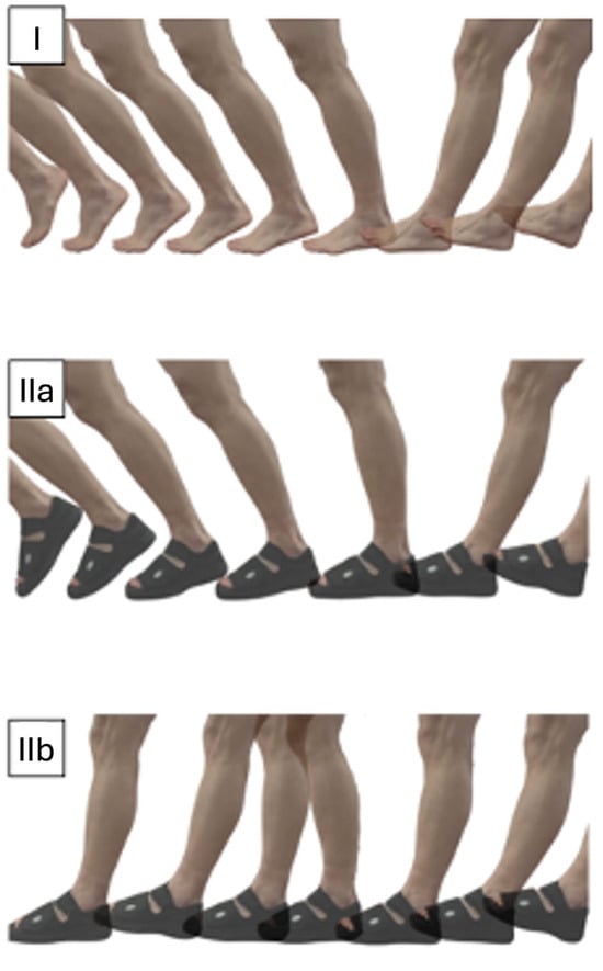 (I) Normal barefoot gait over a measuring plate placed on the track. (IIa) Normal gait in a POS with an inserted pressure measurement insole—putting weight on the whole foot. (IIb) Heel-accentuated “limping gait” in the POS without rolling over the entire foot.