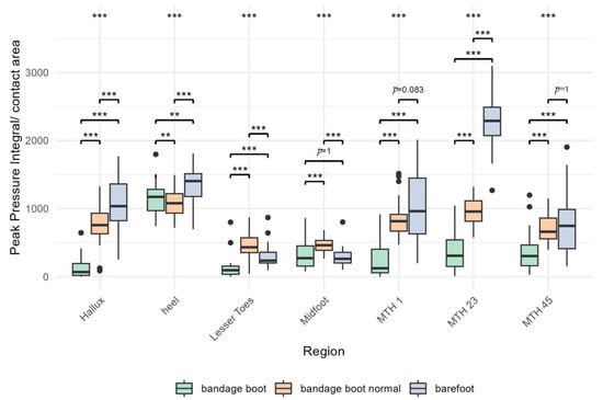 In the MTH1 area (p < 0.001), the highest relative PP was recorded during barefoot walking, measuring 1050.1 ± 513.6 kPa. During normal gait in a bandage shoe, the relative PP was 843.5 ± 267.5 kPa, while the lowest values were observed during the heel-accentuated gait in the bandage shoe, with a relative PP of 258.3 ± 286.6 kPa (Table 1, Figure 4).