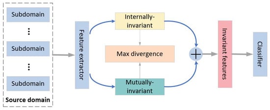 The EEG dataset consists of the source domain and the target domain. The source domain is divided into multiple subdomains sent into the proposed model, as shown in Figure 1. Then, internally and mutually invariant representations are captured through a feature extractor. To differentiate these two kinds of information, a regularization technique is adopted by maximizing the divergence. In the end, the invariant features are concatenated together for classification.