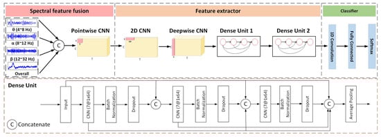 Following the fusion of spectral features, we utilize two convolution layers to learn discriminative temporal–spatial information [,,]. The first CNN layer using a kernel is employed for the EEG channel to extract temporal features. The value of is equal to one-fourth of the data sampling rate, enabling the capture of frequency information at 4 Hz and beyond []. Then, we use a depthwise CNN to extract spatial features across all selected EEG channels. The kernel size is configured to match the number of channels, allowing the compression of data collected at each time step into a single feature map. This strategy leads to a decrease in model parameters and enhances efficiency.
