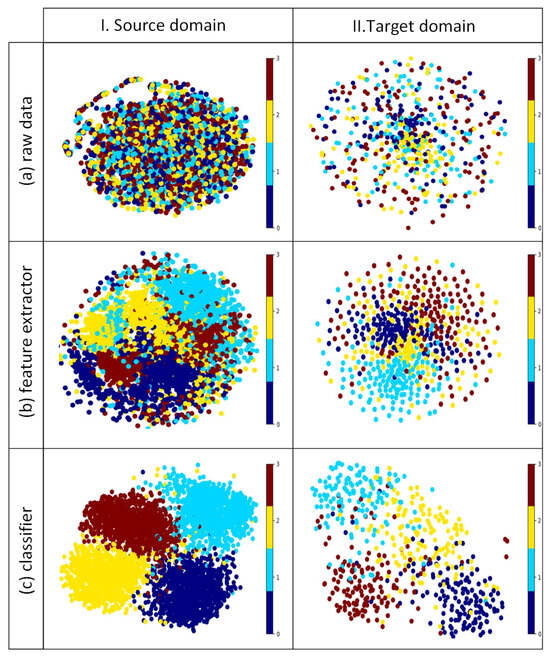 The feature maps obtained by t-SNE. Different colors denote different MI classification tasks. Part (a–c) is the data distribution of the different parts in the student network of the proposed model. Source domain I includes 8 subdomains, namely subjects 1–7 and 9, while the target domain comes from the 7th subject from the BCIC-IV-2a dataset.