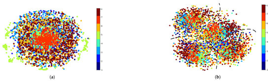 The feature maps obtained by t-SNE. Different colors denote 8 different subdomains, namely subjects 1–7 and 9, which are included in the source domain. (a) The data distribution of raw EEG signals. (b) Feature maps were extracted before the fully connected layer in the proposed model.