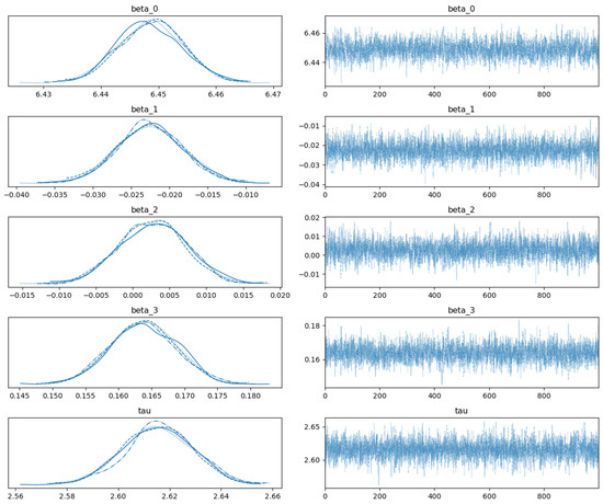 Given prior distributions and likelihood specified by the modeling, the posterior of parameters was numerically estimated using Markov Chain Monte Carlo (MCMC) in PyMC [28]. Table 5 shows the posterior mean, standard deviation, and 95% high-density interval of parameters, and Figure 1 shows the density plots and trace plots of parameters in the MCMC sampling process. In the trace plots, all chains follow a similar pattern and occupy a similar region of the parameter space, and the lines look like fuzzy noise with no long flat areas or trends. The density plots are smooth and unimodal with a clear shape of the posterior, and each chain contributes similarly to the overall distribution. As a result, Figure 1 shows that these samples present adequate mixing in the posterior estimation.