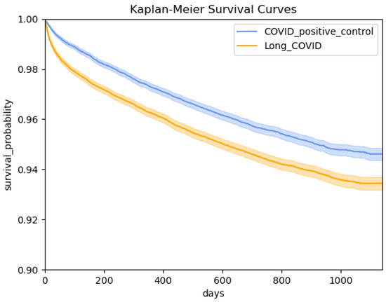 The Kaplan–Meier estimator is a non-parametric method to estimate the survival probability from lifetime data [31]. Figure 2 shows the Kaplan–Meier curves of two groups in the cohort, and according to the curves, the survival probability of patients in both groups decreases as time goes by, and the Long COVID group has an even lower survival probability than the COVID-positive control group from day 0 of survival till the maximum observed survival length. The significance level of difference between the two groups in survival curves could be further examined using the log-rank test [32].
