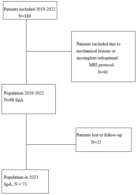 In total, 189 patients with chronic back pain and suspected spondyloarthritis (SpA) were referred by the rheumatology department for MRI examinations between 2019 and 2022. Following comprehensive follow-up and a thorough clinical and paraclinical assessment, 73 patients received a definitive diagnosis of SpA. Notably, 91 patients were eventually diagnosed with another non-inflammatory disease, and 25 were lost to follow-up after the initial MRI examination (