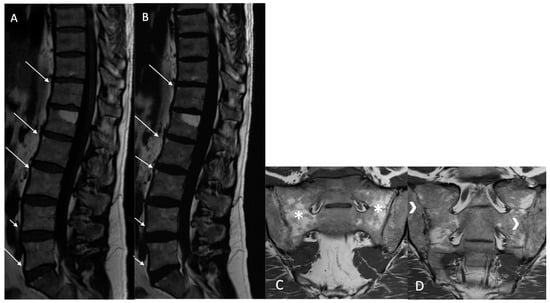 - Crema, M.D.; Miquel, A.; Gouvion, A.; Phan, C.; Li, L.; Menu, Y.; Arrivé, L. Improved detection of subchondral erosions in the sacroiliac joints with T1-weighted fat-suppressed MRI. Eur. Radiol. 2021, 31, 6810–6815. [Google Scholar] [CrossRef] [PubMed]