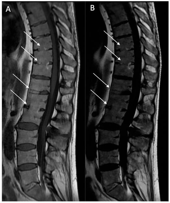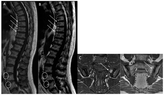 The objective of this study was to compare the diagnostic efficacy of two distinct sets of magnetic resonance imaging (MRI) in detecting structural bone marrow lesions, including fatty lesions (BMF), subchondral erosions (BMEs), ankylosis (A), or sclerosis (BMS), in the dorso-lumbar joints. This comparison specifically focused on the application of T2w MRI Dixon sequence fat–water separation techniques (Dixon FSTs) when acquiring T1-weighted (T1w) images as the reference standard, in patients with a rheumatologic diagnosis of SpA.
