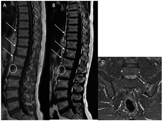 MRI examinations were conducted using a 1.5 T magnet (General Electric Artist-MR-750 W). The imaging protocol included coronal oblique T1 and T2-FS sequences of the SI joints and sagittal T1 and T2w Dixon sequences of the thoracolumbar spine (from T7 to S3) (
