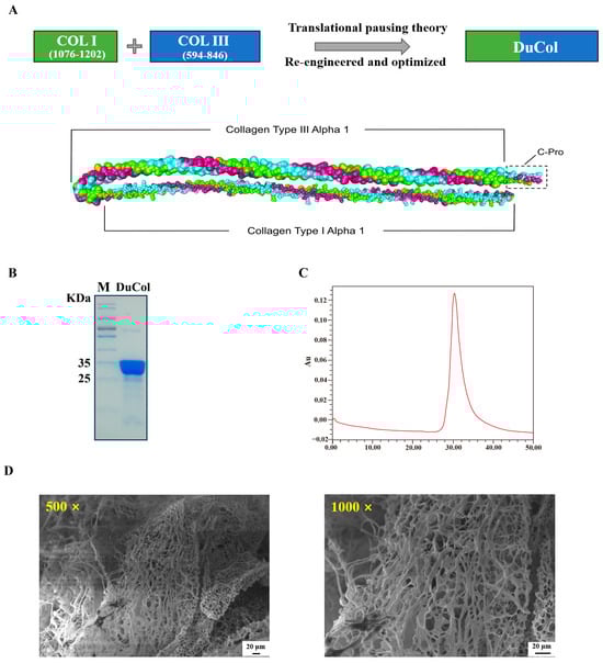 Preparation and characterisation of DuCol. (A) Schematic sequence construction of DuCol and the AlphaFold 3-predicted structure of DuCol reveals a trimeric conformation. (B). SDS-PAGE analysis of DuCol. The purified protein exhibited to be homogeneous with purity of 94.1%. (C) RP-HPLC analysis of DuCol with purity of 93.6%. (D) DuCol (SEM 500×; 1000×) exhibited to be typical loose and porous collagen-like structure.