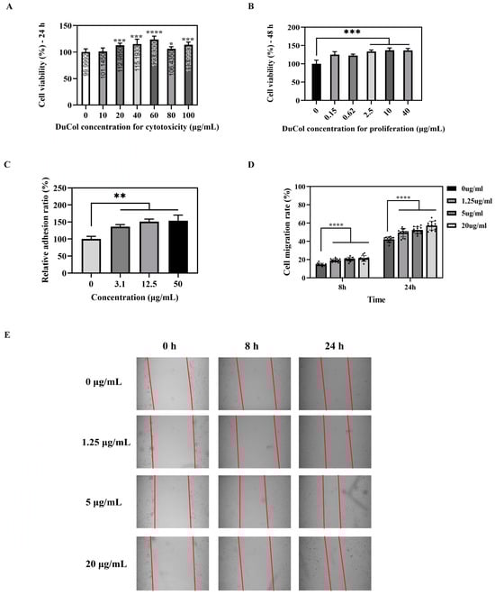 Cytotoxicity assays revealed no significant cell death across all tested concentrations (0.15–100 μg/mL), with cell viability consistently exceeding 100% after 24 h (Figure 2A), confirming DuCol’s biocompatibility and lack of cytotoxic effects. To evaluate proliferative effects, cells were treated with DuCol at 2.5–40 μg/mL for 48 h. As shown in Figure 2B, DuCol exerted a more pronounced proliferative effect across the concentration range of 2.5–40 μg/mL. Cell proliferation rates within this interval were elevated by approximately 30% relative to the control group, with highly significant differences (p < 0.001). By comparison, cell adhesion rates on 96-well plates coated with DuCol at 3.1 μg/mL, 12.5 μg/mL, and 50 μg/mL increased by 36.2%, 50.8%, and 53.6%, respectively, compared to the control (Figure 2C), demonstrating DuCol’s excellent pro-adhesive properties in a dose-dependent manner. Cell migration rates were evaluated by calculating the ratio of the wound area difference between 0 h and each time point to the initial wound area at 0 h. As shown in Figure 2D, E, at 8 h, the cell migration rates for the 1.25 μg/mL, 5 μg/mL, and 20 μg/mL doses were 19.1%, 20.4%, and 21.2%, respectively, which were significantly higher than the control group (14.5%, p < 0.001). By 24 h, these rates increased to 49.5%, 52.3%, and 57.2%, respectively, in the experimental groups, all notably greater than the control (42.1%, p < 0.001). These results demonstrate that DuCol promotes cell migration in a dose-dependent manner with significant efficacy.
