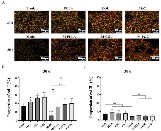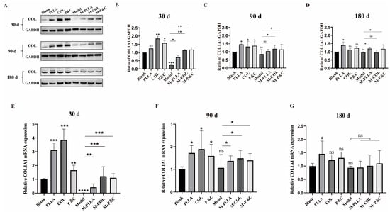 Sirius red staining was employed to visualise the distribution and to quantify changes in type I and type III collagen within the dermal layer of skin tissue. Owing to the difference in the refractive index, these collagen types exhibit distinct colours under polarised light microscopy: type I collagen stains red or yellow, while type III collagen appears green []. The results are shown in Figure 4. In the early-stage model group, Sirius red-stained sections showed sparser distributions of both red (type I) and green (type III) collagen compared to the blank group, indicating that D-galactose induced dermal damage and loss of both collagen types. After intervention with filler materials, the distribution proportion and density of type I collagen in the dermis increased, whereas type III collagen levels remained unaffected. At 30 days post-injection, dermal type I collagen content rose significantly in all treatment groups, with the COL group demonstrating greater accumulation than the PLLA group. By 90 and 180 days, while all treatment groups retained higher type I collagen percentages compared to the control, the COL group’s efficacy was surpassed by PLLA. The P&C group exhibited higher type I collagen proportions than both the COL and PLLA monotherapy groups. Overall, quantification of dermal type I collagen revealed that DuCol implants outperformed PLLA in the early treatment phase, highlighting DuCol’s superior early-stage capacity to improve skin ageing parameters (Figures S3 and S4). The COL1A1 accumulation in aged skin peaked at 30 days after DuCol injection. Conversely, PLLA demonstrated more favourable pro-collagen expression effects at 90 and 180 days, indicating divergent temporal efficacy profiles between the materials.