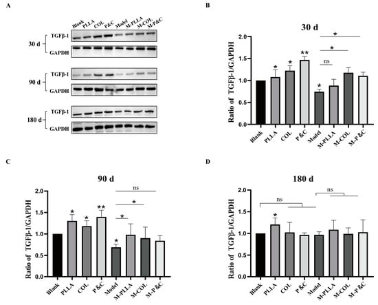 TGFβ-1 expression levels in rat skin tissues at different time points post-treatment. (A) Western blot analysis. Representative immunoblots of TGFβ-1 and GAPDH (loading control) in skin tissues from the rats treated with DuCol, PLLA, or PLLA/DuCol combination (P&C) at 30, 90, and 180 days. (B) Quantitative TGFβ-1/GAPDH ratio after 30 days of injection. Densitometric analysis of Western blot bands normalised to GAPDH. Data expressed as fold change relative to untreated controls. (C) Quantitative TGFβ-1/GAPDH ratio after 90 days of injection. Densitometric analysis of Western blot bands normalised to GAPDH. Data expressed as fold change relative to untreated controls. (D) Quantitative TGFβ-1/GAPDH ratio after 180 days of injection. Densitometric analysis of Western blot bands normalised to GAPDH. Data expressed as fold change relative to untreated controls. (n = 6; * p < 0.05; ** p < 0.01; ‘ns’: p > 0.05).