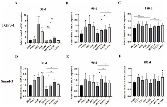 The mRNA expression levels of TGF-β1 and Smad3 in rat skin tissues at different time points post-treatment. (A–C) TGF-β1 mRNA expression. RT-qPCR analysis of TGF-β1 transcript levels normalised to GAPDH after 30/90/180 days of injection. (D–F) Smad3 mRNA expression. RT-qPCR analysis of Smad3 transcript levels normalised to GAPDH after 30/90/180 days of injection. (n = 6; * p < 0.05; ** p < 0.01; *** p < 0.001; ‘ns’: p > 0.05).