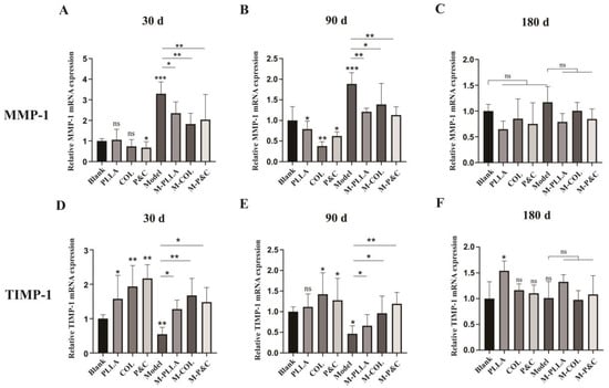 The mRNA expression levels of MMP-1 and TIMP-1 in rat skin tissues at different time points post-treatment. (A–C) MMP-1 mRNA expression. RT-qPCR analysis of MMP-1 transcript levels normalised to GAPDH after 30/90/180 days of injection. (D–F) TIMP-1 mRNA expression. RT-qPCR analysis of TIMP-1 transcript levels normalised to GAPDH after 30/90/180 days of injection. (n = 6; * p < 0.05; ** p < 0.01; *** p < 0.001; ‘ns’: p > 0.05).