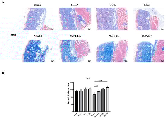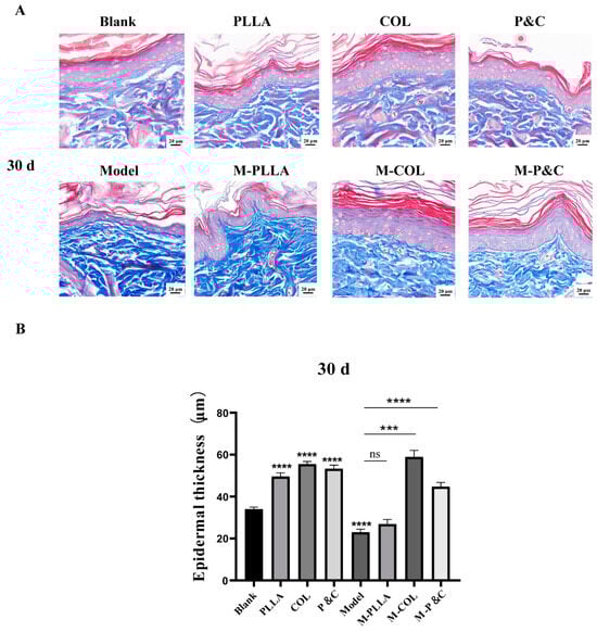 Masson staining was used to assess epidermal thickness changes across rat groups, with the results shown in Figure 8. At 30 days post-injection, the model group exhibited significantly reduced epidermal thickness compared to the blank control group, indicating that D-galactose induced damage to the rat skin tissue. In the M-PLLA group, epidermal thickness did not differ significantly from the model group. By contrast, both the M-COL and M-P&C groups showed substantial increases in epidermal thickness (p < 0.001), alongside denser basal cell arrangement and enhanced cellularity within the basal layer. It is hypothesised that, at 30 days post-injection, DuCol ameliorates epidermal atrophy in the ageing skin tissue and promotes significant accumulation of the epidermal layer matrix, thereby providing a robust filling effect. At 90 days post-injection, epidermal thickness in the M-PLLA, M-COL, and M-P&C groups was significantly greater than in the model group; however, the increase in the M-COL group was less pronounced than in the M-PLLA group (Figure S5). These findings indicate that PLLA begins to exert its filling and anti-wrinkle effects by 90 days post-injection, while DuCol maintains its anti-ageing activity. By 180 days post-injection, epidermal thickness did not differ between the model and blank control groups, likely reflecting normalisation of the acute ageing phenotype in rats following 180 days of recovery (Figure S6). The M-PLLA group showed no significant difference in epidermal thickness compared to the model group, whereas the M-COL group retained greater epidermal thickness than the model group. This suggests that the effect of DuCol sustains its early-stage effect on enhancing epidermal thickness, whereas PLLA does not demonstrate long-term maintenance of this parameter. Notably, epidermal thickness across all groups decreased at 180 days compared to 30 days and 90 days post-injection. This is hypothesised to reflect the natural onset of senescence in rats by 180 days post-injection, manifesting as age-related morphological changes.