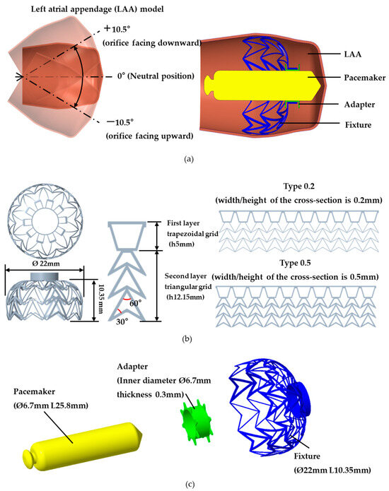 Models used in the analysis: (a) overview of the analysis model and LAA orifice orientation; (b) fixture geometry and features; (c) key dimensional characteristics of the pacemaker, adapter, and fixture.