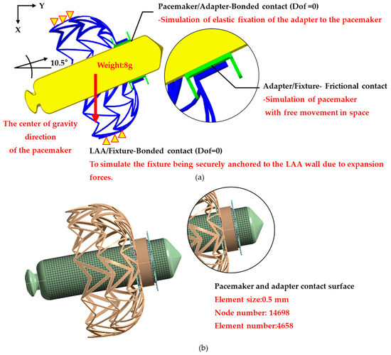 To verify that the designed adapter effectively secures the pacemaker to the fixation mechanism, this study employs finite-element analysis (FEA) to evaluate the impact of gravitational forces on fixation stability. The analysis used the Rigid Dynamics module in ANSYS 2023R2 (ANSYS Inc., Canonsburg, PA, USA). The drop analysis model comprises the fixture, adapter, and pacemaker (Figure 2a). Although the fixture is made of nickel–titanium alloy (Nitinol), it is assumed to be fully expanded in the drop analysis. To simplify the material properties, the fixture was modeled as an elastic material with a Young’s modulus of 60 GPa and a Poisson’s ratio of 0.36. The pacemaker casing, made of titanium alloy [3], is assigned to Young’s modulus of 115 GPa, a Poisson’s ratio of 0.361, and a weight of 8 g. The adapter is assumed to be composed of polylactic acid (PLA), with a Young’s modulus of 2.6 GPa and a Poisson’s ratio of 0.35 [20]. The mesh model utilizes a free mesh at the contact interface between the pacemaker and adapter, with an element size of 0.5 mm. The mesh density and distribution are illustrated in Figure 2b. The adapter-pacemaker interface was defined as a bonded contact, meaning the adapter elastically secures the pacemaker without relative displacement. The fixture–adapter interface is modeled as a frictional contact, with a friction coefficient of 0.3, indicating sliding resistance proportional to the friction coefficient, allowing the two components to separate. The boundary condition assumes the outer surface of the fixture was fixed (Dof = 0), simulating its attachment within the LAA. To simulate the gravitational effect on the pacemaker, a standard Earth gravity load was applied in the pacemaker barycenter of the X-direction, assessing the resulting displacement and confirming whether the fixture and adapter can provide adequate fixation stability.