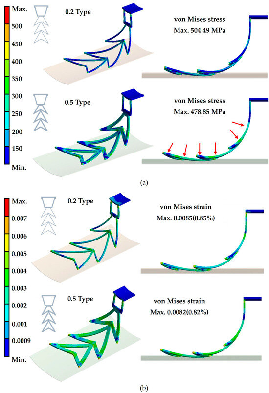 The results of the fixture-expansion force analysis for 0.2-type and 0.5-type fixtures. (a) Fixture von Mises stress. (b) Fixture von Mises strain.