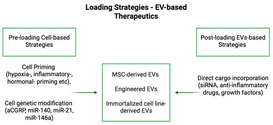 | Co-incubation | Endogenous or exogenous | Passive | Cells are incubated with drugs, allowing uptake before EV secretion, or EVs are incubated with drugs, allowing for simple diffusion of cargo into EV [60,63] | Simple, but efficiency depends on drug type and conditions [60,63] |