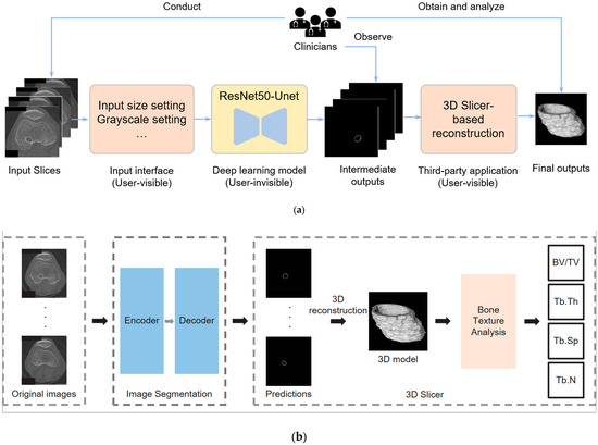 Deep learning-based bone texture analysis system: (a) the interaction between clinicians and the system, including data input, observing intermediate outputs, and obtaining and analyzing the final output; (b) the technique details of deep learning-based 2D image segmentation and 3D-slicer-based reconstruction.