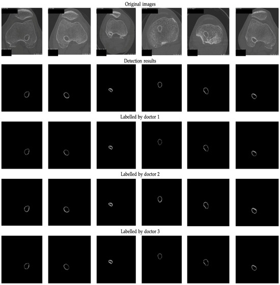 To further investigate the disparities between the different actual labeling results, i.e., inter-observer variability, we conducted an analysis of the three distinct sets of masks manually labeled by the medical experts, as shown in Table 2. Our analysis revealed that the labeling results of the first and third doctors displayed a relatively high degree of similarity, whereas the second labeling results demonstrated slightly lower congruence with the other two groups. This observation highlights the fact that even when confronted with the same image, individual doctors may make dissimilar choices regarding the regions of interest. The variation in their annotation results can be attributed to differences in experience and, consequently, exert a discernible impact on the outcomes of both the training and the subsequent detection processes. Higher inter-observer variability indicates less consistency among experts regarding the delineation of this structure. Relying solely on annotations from a single expert may constrain the model’s generalizability. In such cases, it is recommended to incorporate consensus from multiple experts through voting or label fusion techniques to establish a more reliable ground truth.