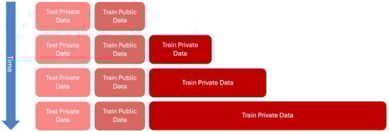 Structure of the Private Data Incrementalization (PDI) process. Across the layers, the structure remains consistent, but the proportion of private data in the training set increases incrementally to reflect the progressive availability of clinical data in real-world settings.
