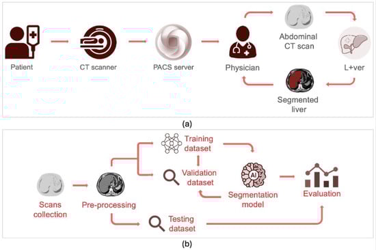 The integration of artificial intelligence (AI), particularly Machine Learning (ML) algorithms, in healthcare has the potential to revolutionize diagnostic and treatment processes, particularly in medical image segmentation. One of the main challenges in the medical field is the accurate and efficient segmentation of organs, such as the liver, in imaging modalities like computed tomography (CT) []. This task is essential for diagnosing, planning, and monitoring treatments, including those in radiotherapy and nuclear medicine, where precise organ boundaries are necessary for treatment planning. However, the current commercial solutions for liver segmentation are often expensive, and free alternatives can lack reliable performance and replicability.